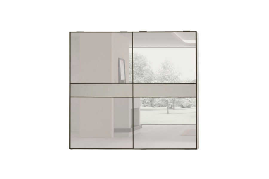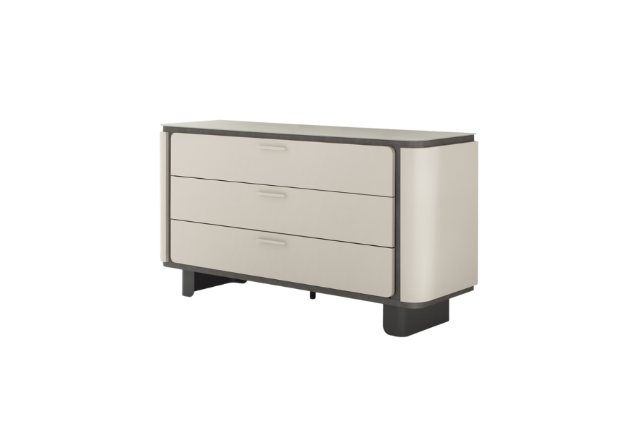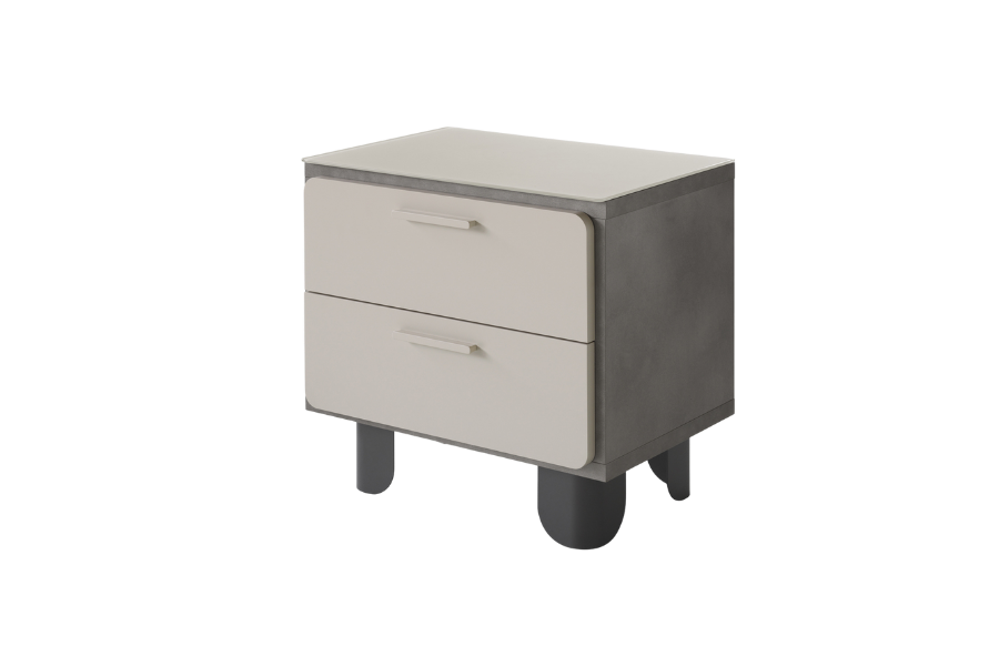 Le stondature dei fianchi e dei piani dei comodini, i top in vetro satinato e le maniglie in acciaio ton su ton definiscono un’estetica sobria, ricercata e luminosa.