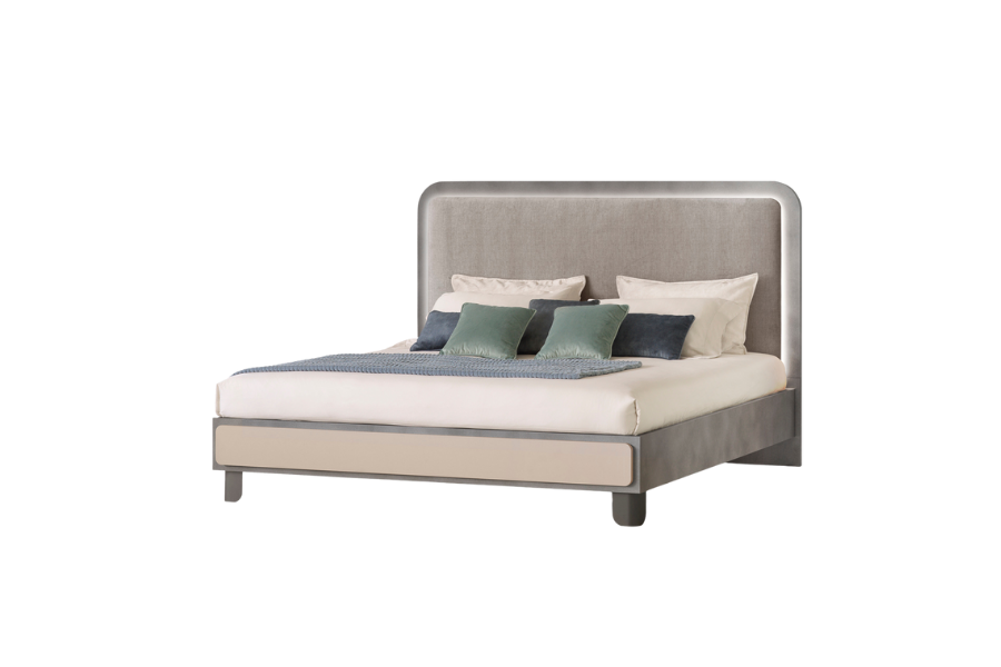 Grande protagonista dell’arredamento della camera da letto, il letto imbottito. La luce LED che incornicia l’imbottitura in morbido velluto, dà vita a un affascinante contrasto cromatico e materico.