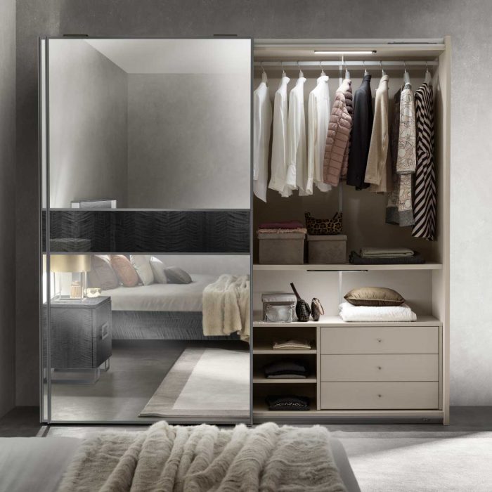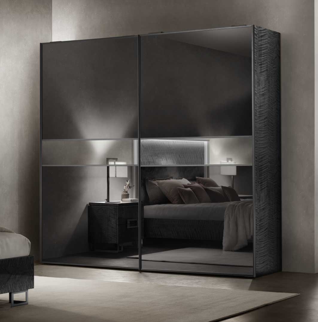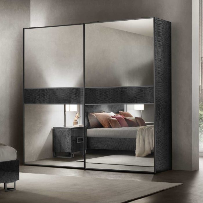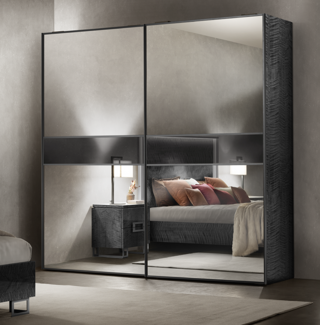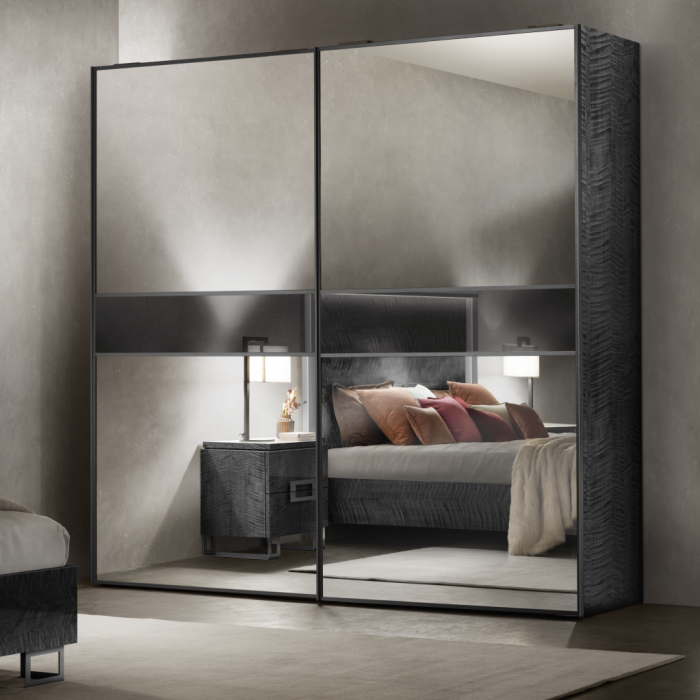 Ogni armadio, infatti, può essere “composto” in base al proprio stile e ai propri gusti scegliendo tra diverse combinazioni. Le ante a specchio sono disponibili in argento, bronzo e fumé. Ad esse è possibile abbinare un inserto centrale in argento, bronzo, fumé o Sycamore, creando un armadio “monocromatico” oppure con elementi a contrasto.