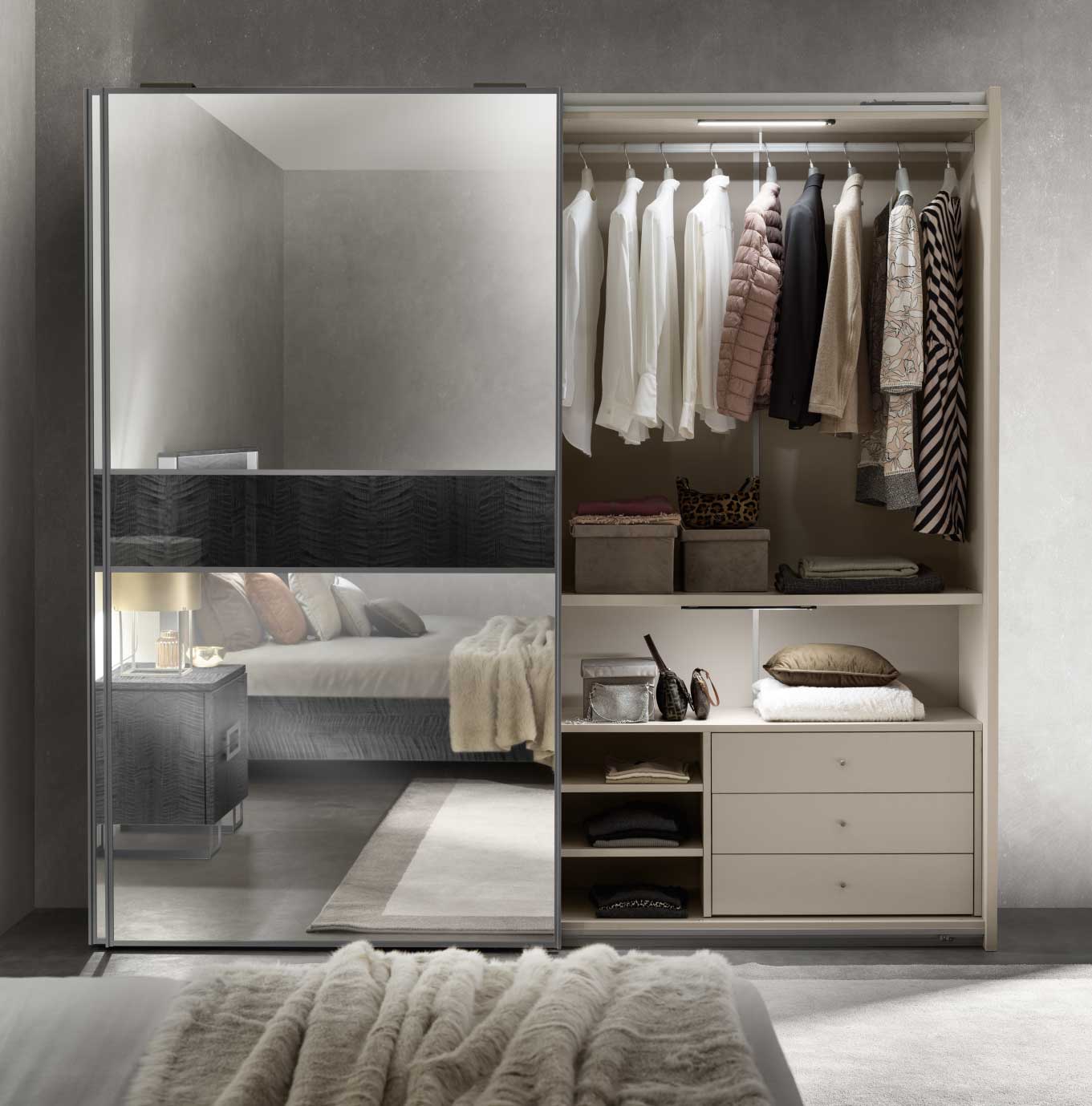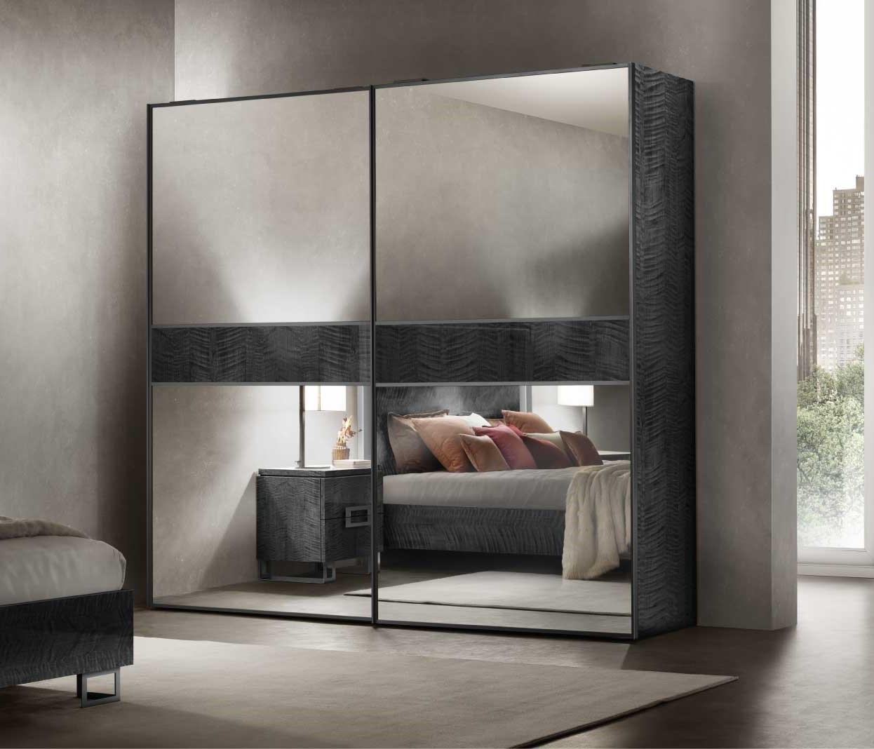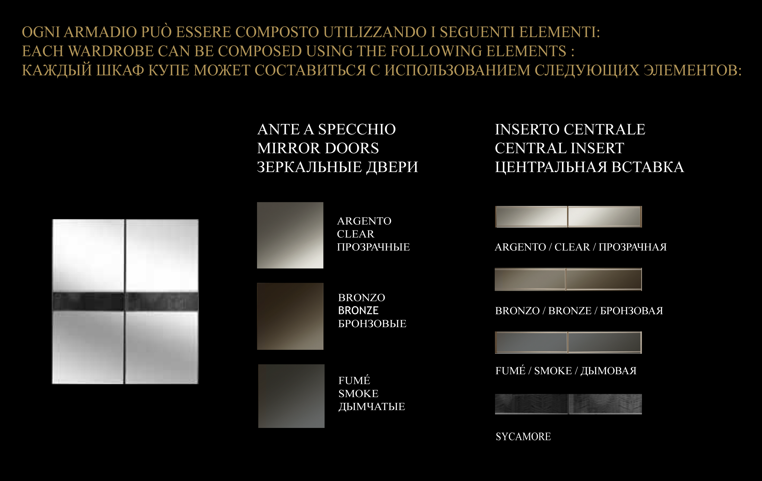 Ogni armadio, infatti, può essere “composto” in base al proprio stile e ai propri gusti scegliendo tra diverse combinazioni. Le ante a specchio sono disponibili in argento, bronzo e fumé. Ad esse è possibile abbinare un inserto centrale in argento, bronzo, fumé o Sycamore, creando un armadio “monocromatico” oppure con elementi a contrasto.