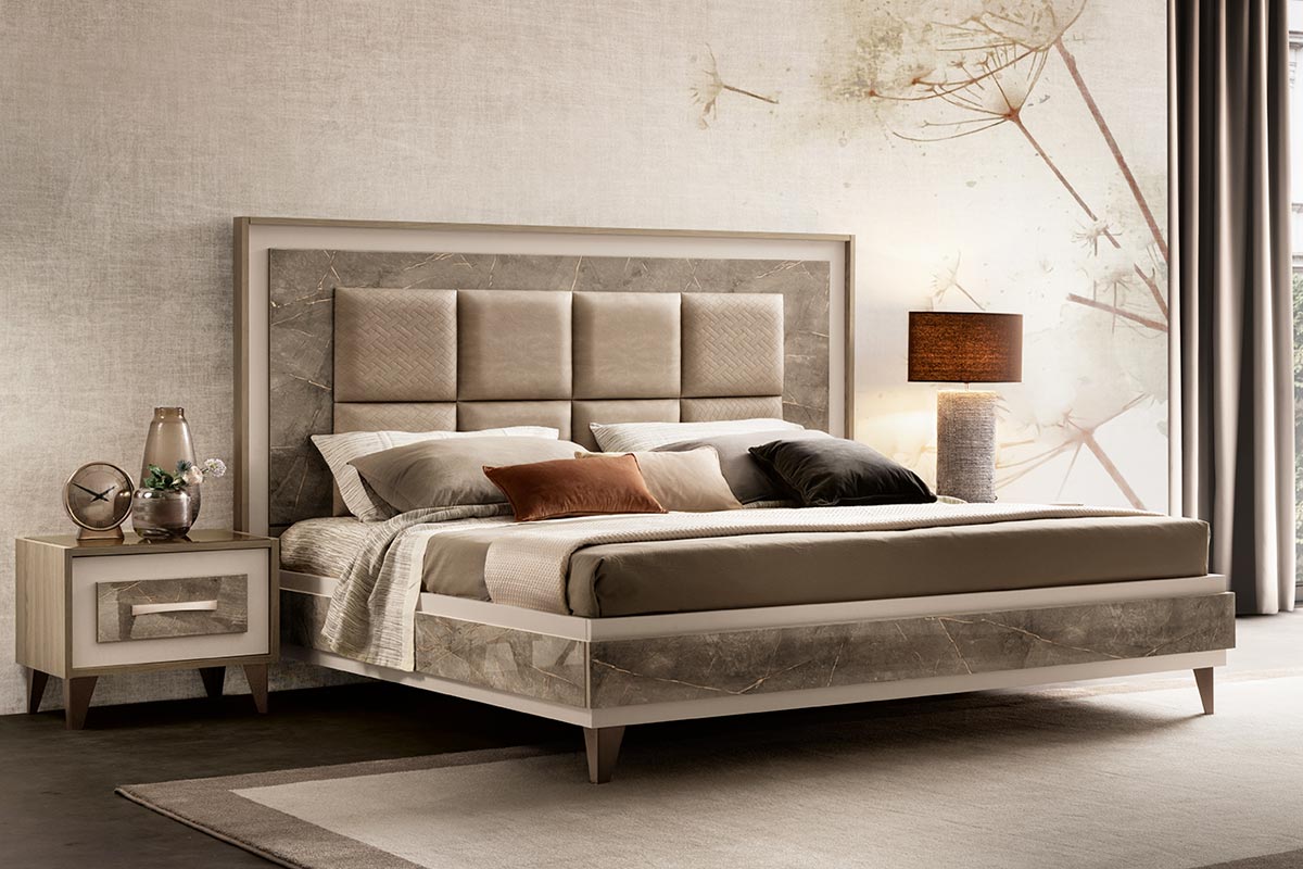 Il letto imbottito Ambra è un vero e proprio elemento classico reinterpretato in chiave contemporanea. L’imbottitura dal disegno quadrato al centro della testiera riecheggia il capitonné di stampo classico lasciando comunque spazio all’eleganza della finitura marmo.