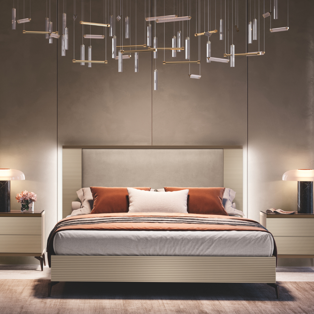Le linee tridimensionali effetto cannettato corrono lungo il giroletto e il pannello di testiera, creando una texture dinamica che dona profondità e movimento all’ambiente. La testiera imbottita, incorniciata da una delicata illuminazione LED integrata, diffonde un’atmosfera accogliente e sofisticata, trasformando il riposo in un’esperienza di stile. La struttura in tonalità color fango avvolge le superfici cannettate con eleganza, mentre le basi geometriche in metallo con finitura bronzo alleggeriscono visivamente i volumi.