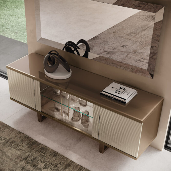 Lo specchio piccolo impreziosisce il soggiorno e amplia la percezione dello spazio, creando un dialogo sofisticato con la credenza sottostante. Lo specchio medio apporta coerenza raffinata alla camera da letto, allineandosi perfettamente alla geometria della cassettiera e valorizzando il design Adora. Per un effetto scenografico più marcato, lo specchio grande arricchisce il soggiorno Linea, la sua cornice rigata in legno riprende il motivo lineare del buffet e dona continuità stilistica all’intero ambiente.