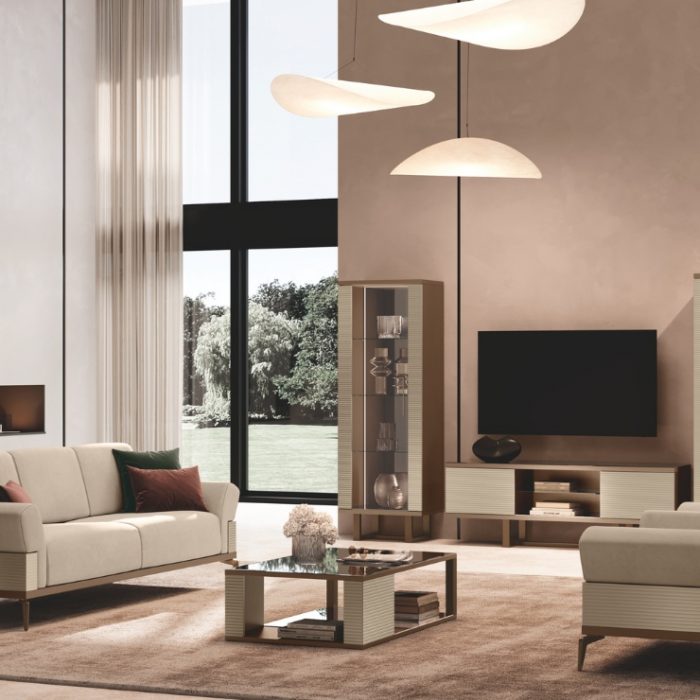 Slanciata e contemporanea, la vetrina a 1 anta esprime l’eleganza della collezione con frontale cannettato champagnestruttura color fango e basamento in metallo finitura bronzo. La luce LED laterale e i ripiani in vetro temperato creano un’atmosfera luminosa e raffinata, perfetta per valorizzare oggetti decorativi e porcellane.​