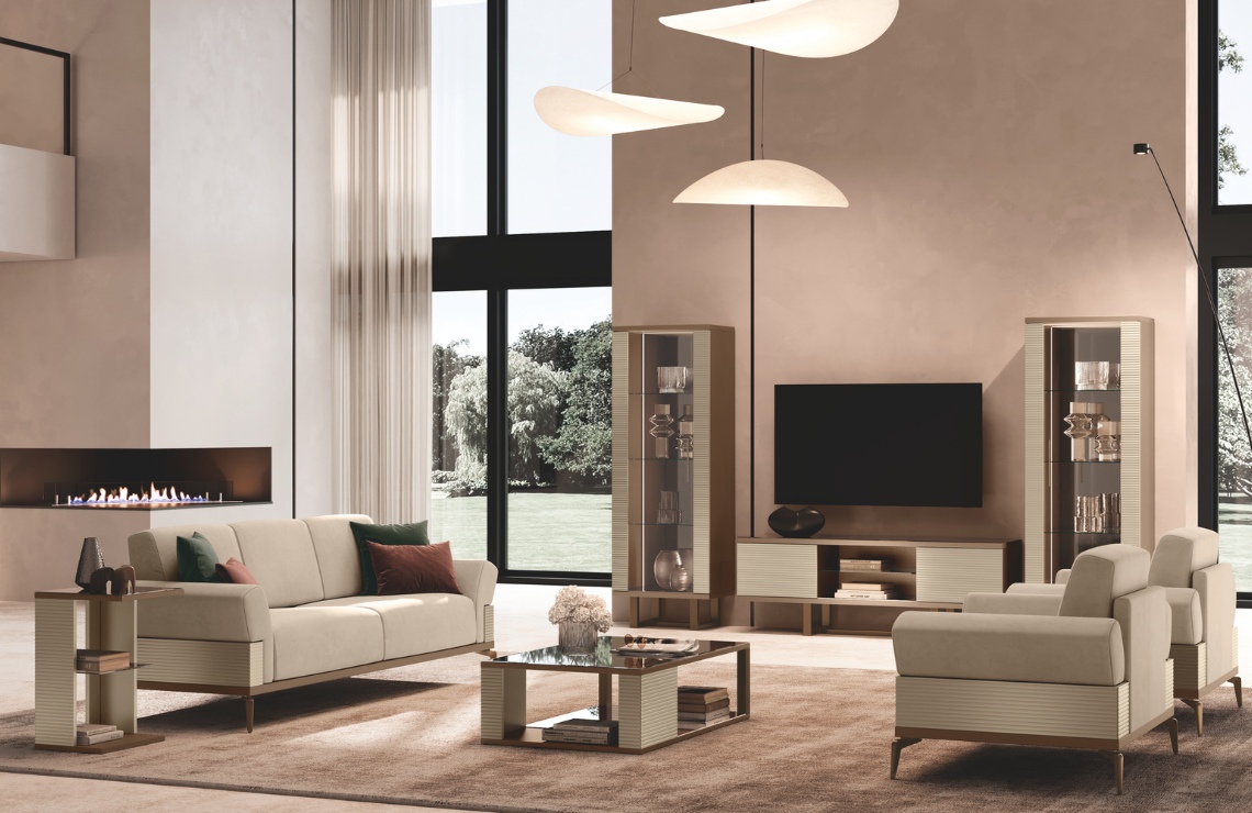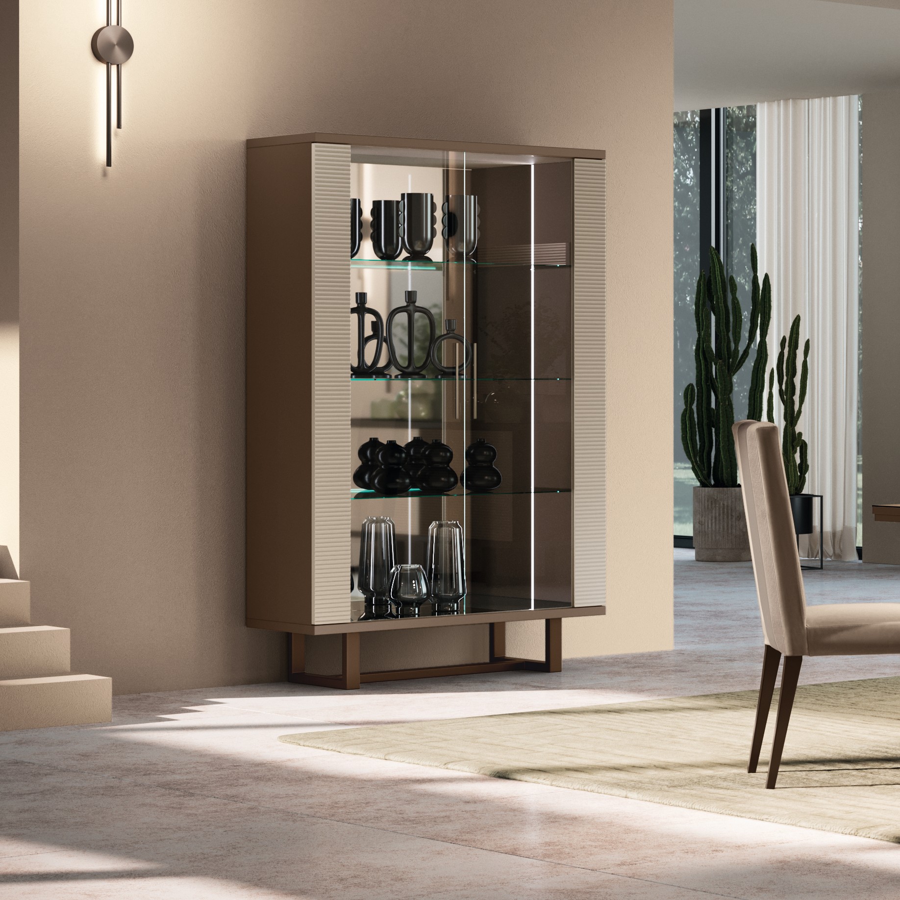 Slanciata e contemporanea, la vetrina a 1 anta esprime l’eleganza della collezione con frontale cannettato champagnestruttura color fango e basamento in metallo finitura bronzo. La luce LED laterale e i ripiani in vetro temperato creano un’atmosfera luminosa e raffinata, perfetta per valorizzare oggetti decorativi e porcellane.​