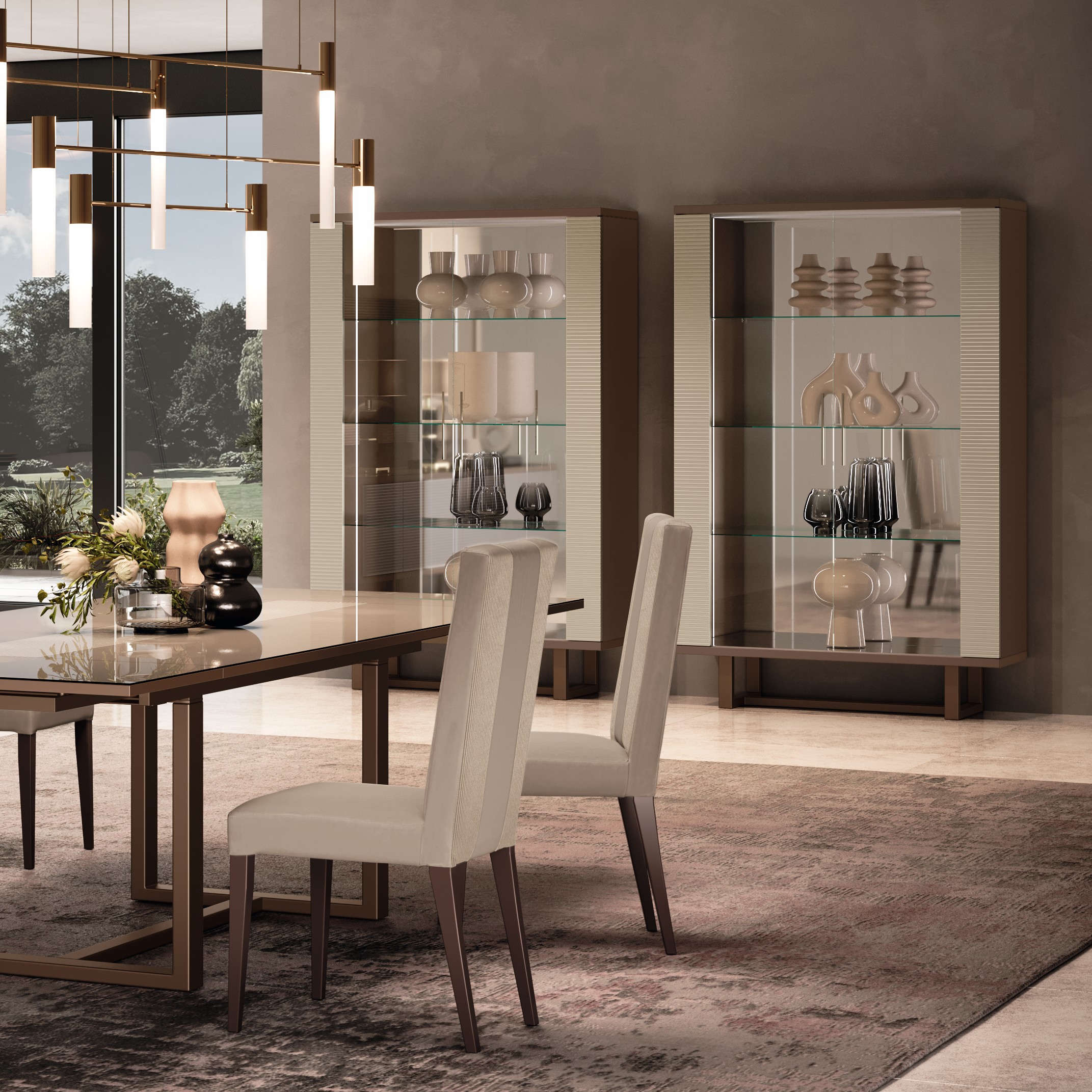 La vetrina a 2 ante riprende lo stesso contrasto cromatico e materico tra struttura fango e frontali cannettati champagne, offrendo una capacità contenitiva maggiore. Anche in questa configurazione, il basamento bronzo e l’illuminazione LED laterale alleggeriscono i volumi ed esaltano la trasparenza dei ripiani in vetro temperato, in pieno stile luxury-à-porter di Adora.