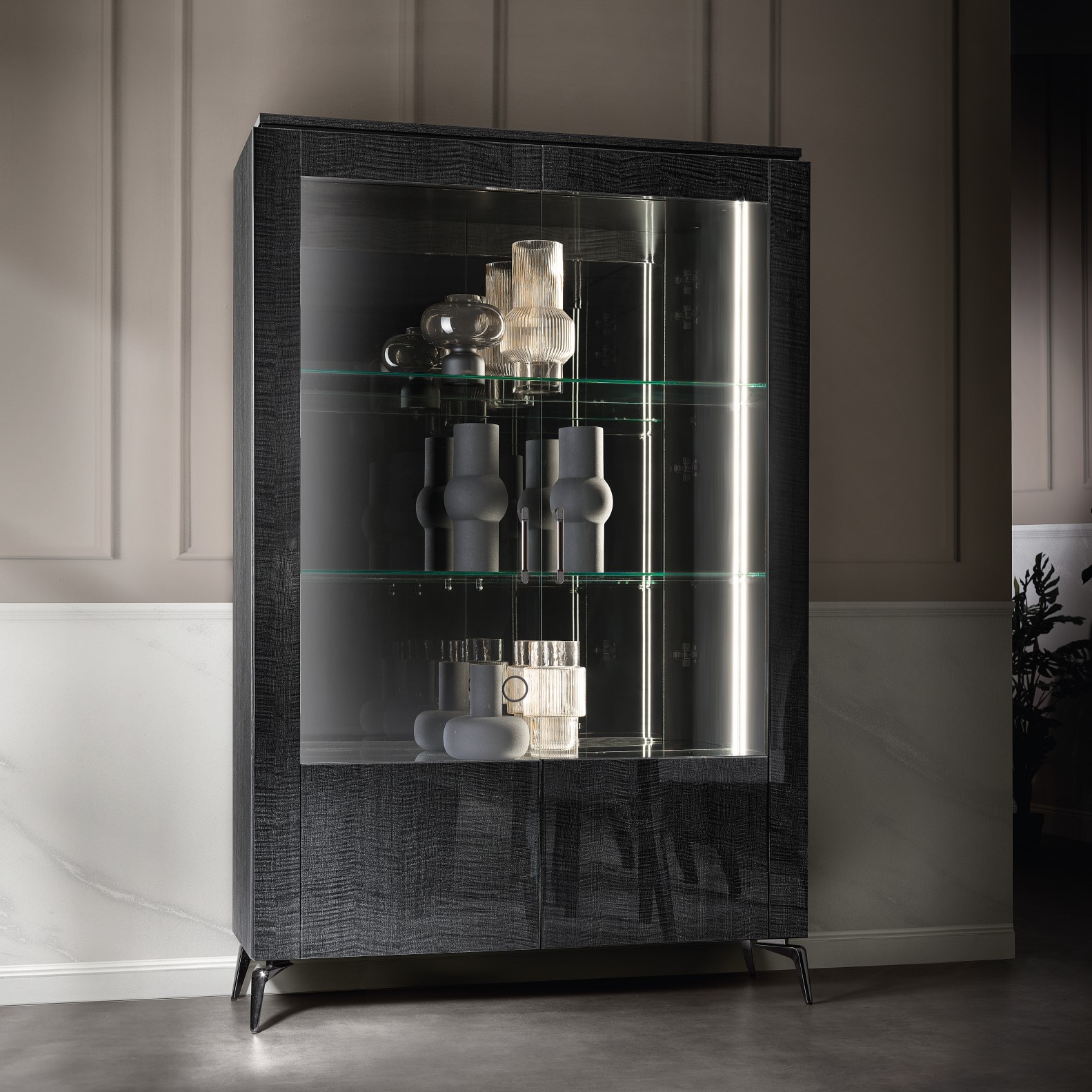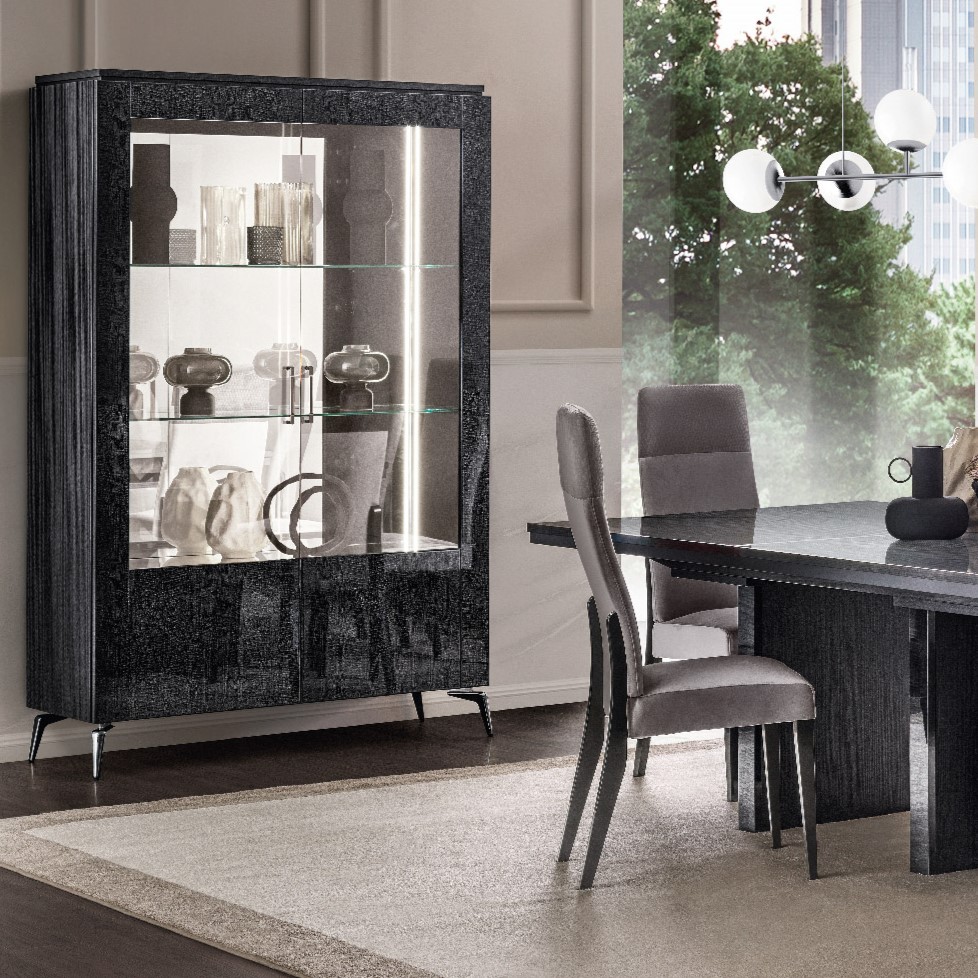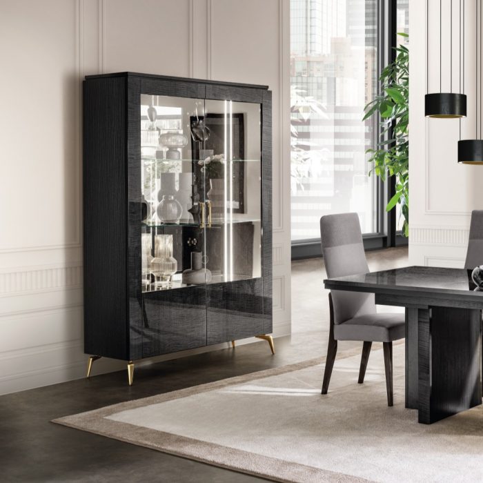 Austera e raffinata, la vetrina a un’anta in vetro Meridiana esprime tutto il carattere luxury di Adora. L’effetto lucido della finitura Sycamore è amplificato dalla barra LED che illumina l’interno con i vetri specchiati.