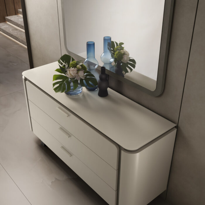 Il comò Perla unisce forme morbide e arrotondate a una palette pulita e raffinata, per un’eleganza sobria e versatile.