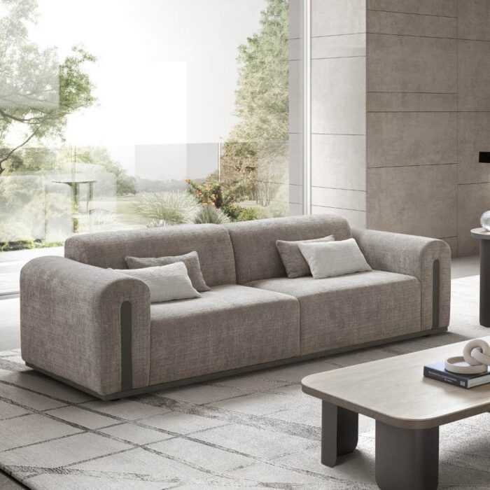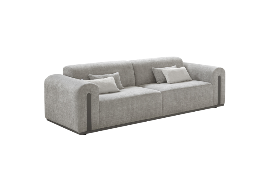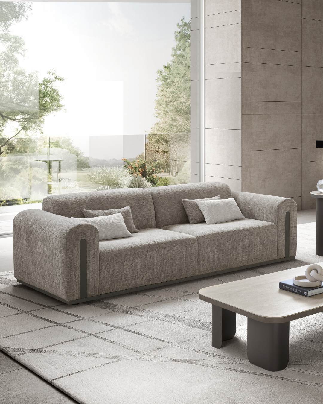 Il divano Perla ridefinisce la zona giorno con una presenza scenica inedita. Il bracciolo tondeggiante con inserto antracite esprime la meticolosa ricerca di continuità con l’ambiente soggiorno.