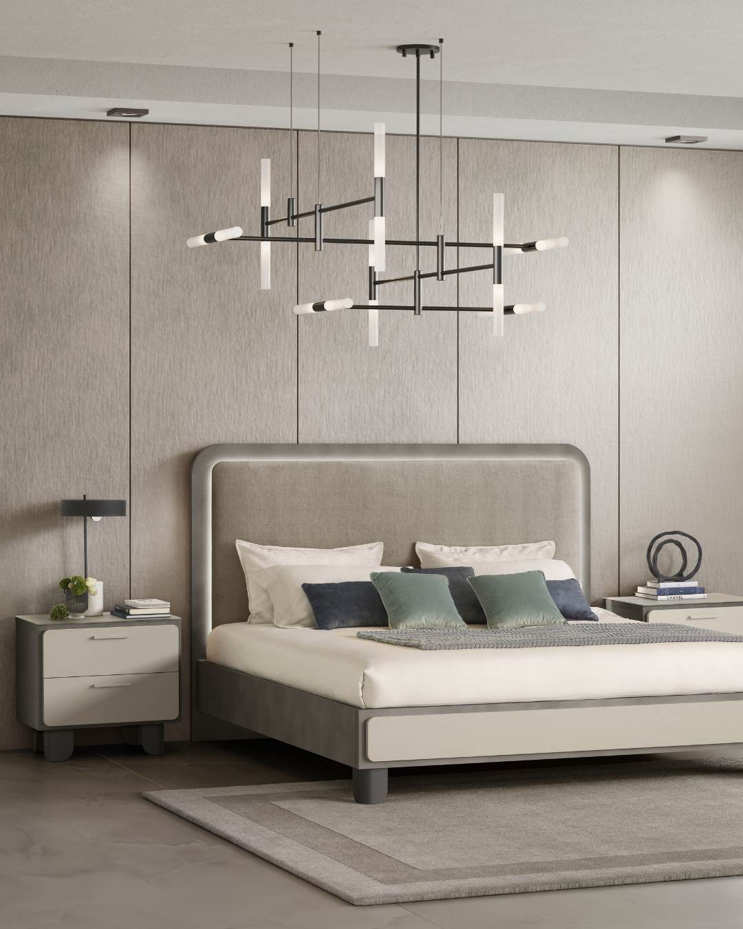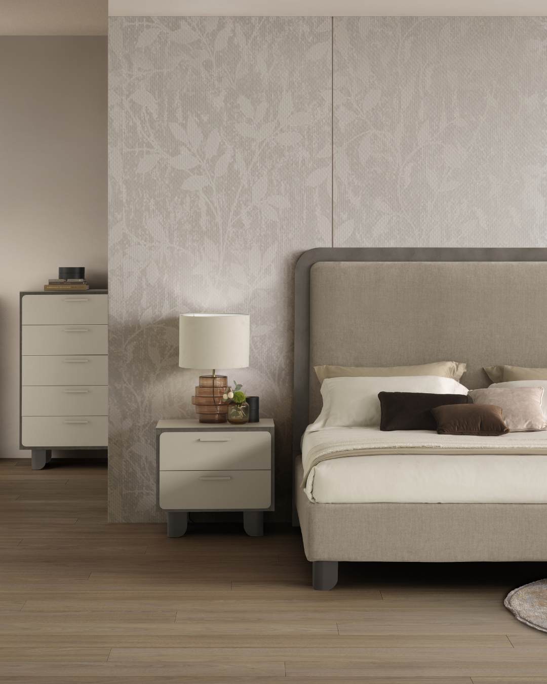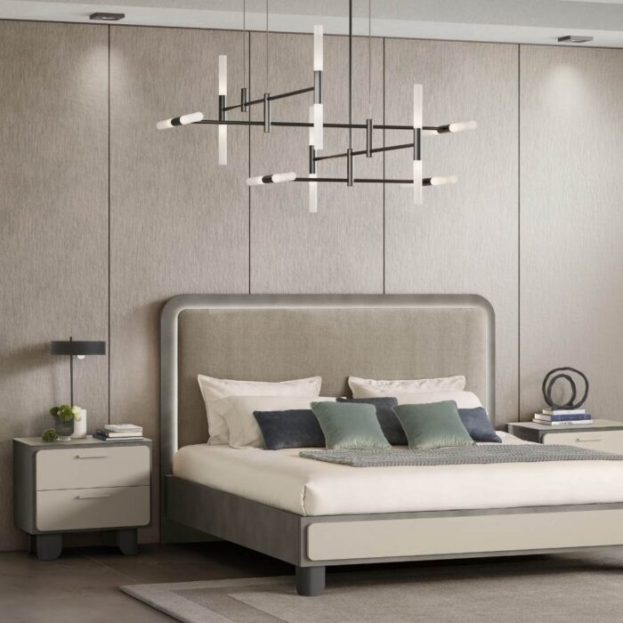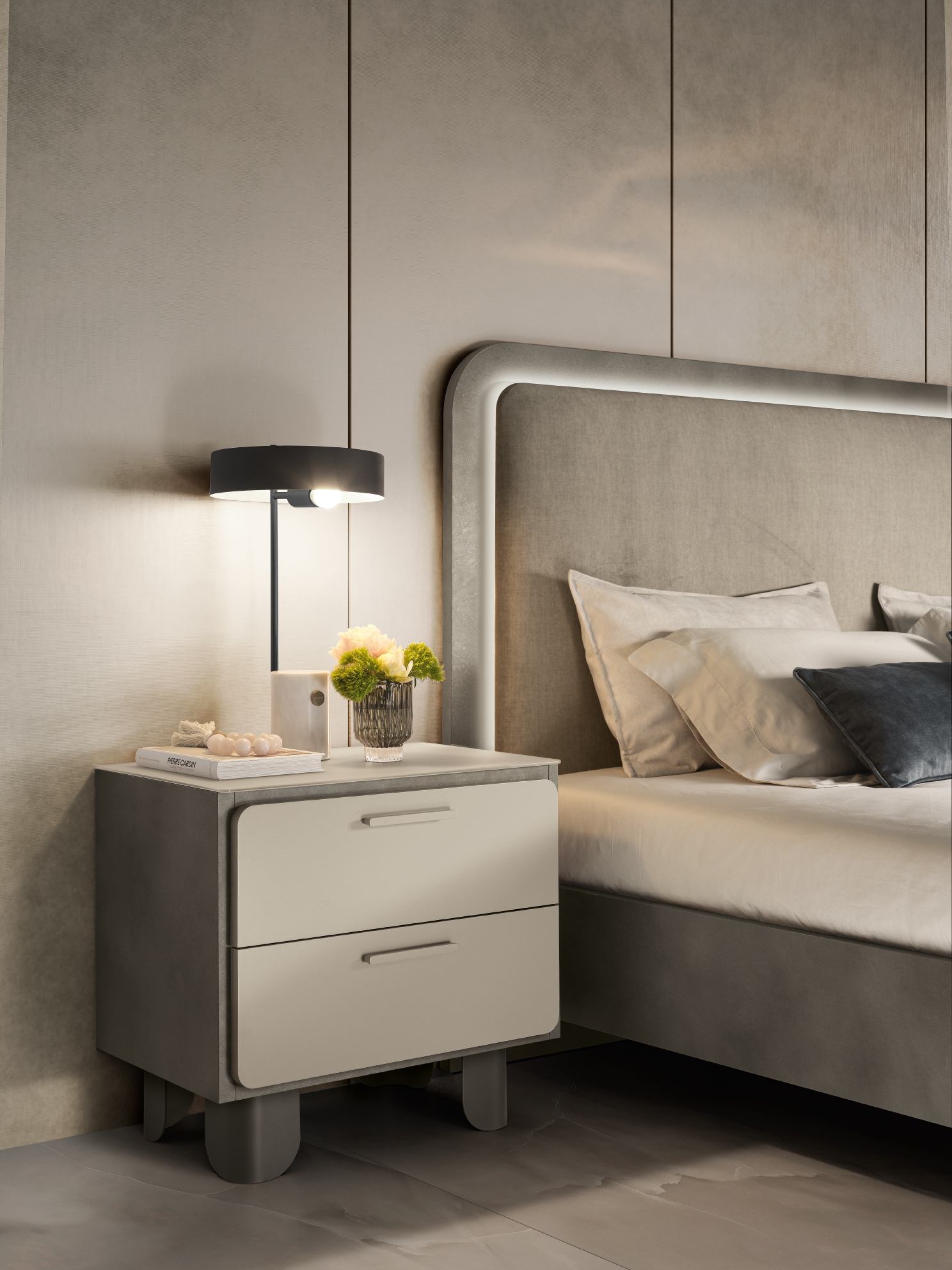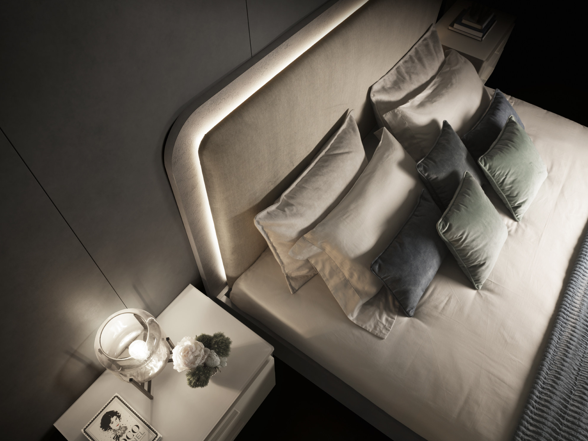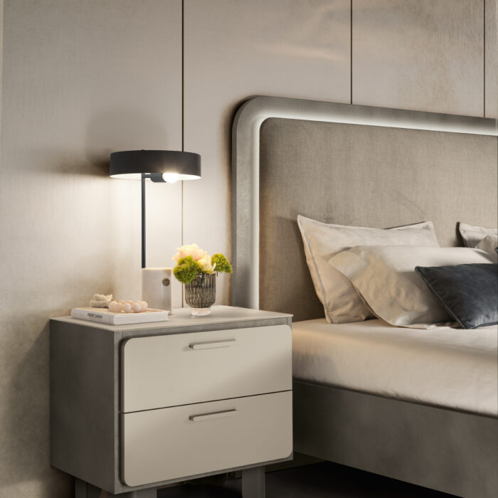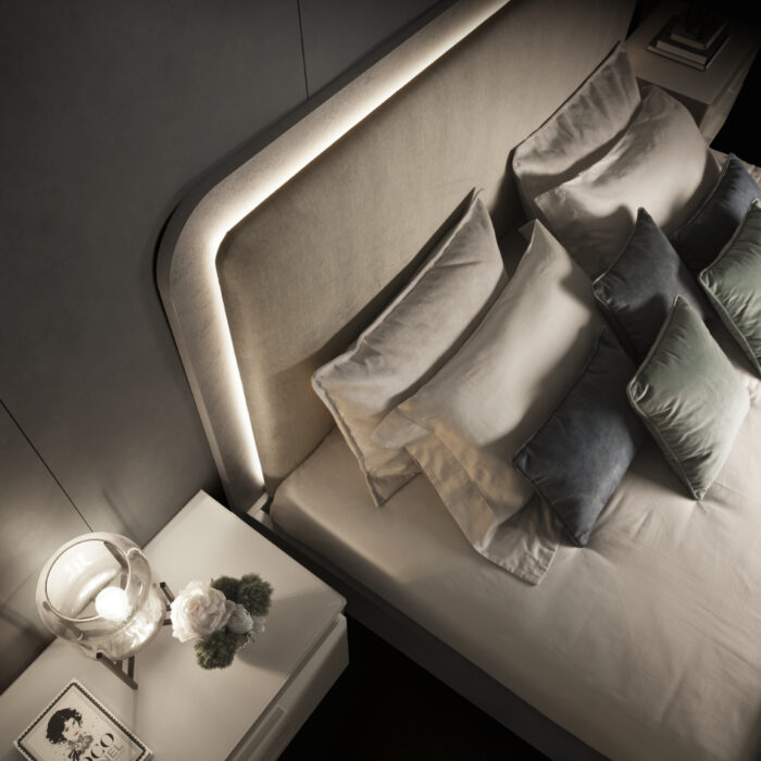 Comune denominatore, la testiera imbottita impreziosita dalla luce LED integrata che incornicia il trapuntato in morbido velluto, per dare ancora più risalto al contrasto tra l’imbottito e la cornice antracite.