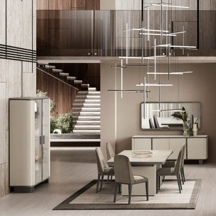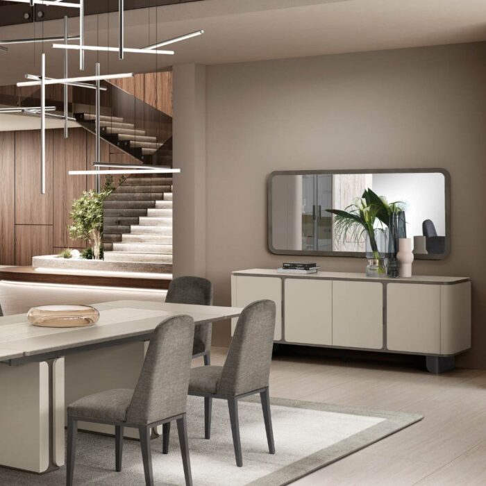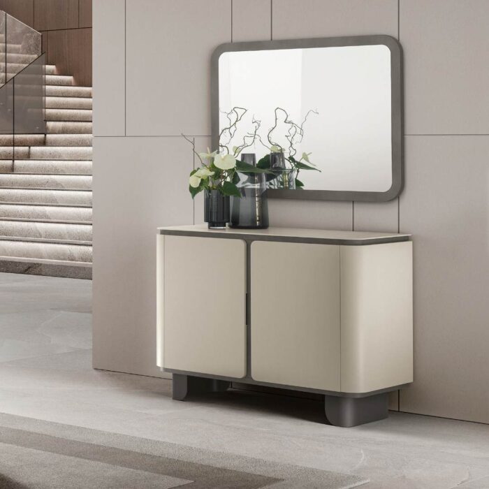 La cornice grigio antracite, definita da angoli stondati, ne richiama il segno morbido e contemporaneo. In vetro molato è disponibile in una versione piccola da abbinare al contromobile a 2 ante e grande per il contromobile a 4 ante.