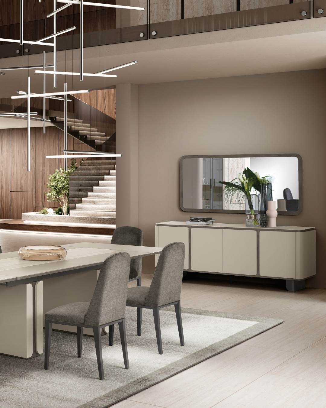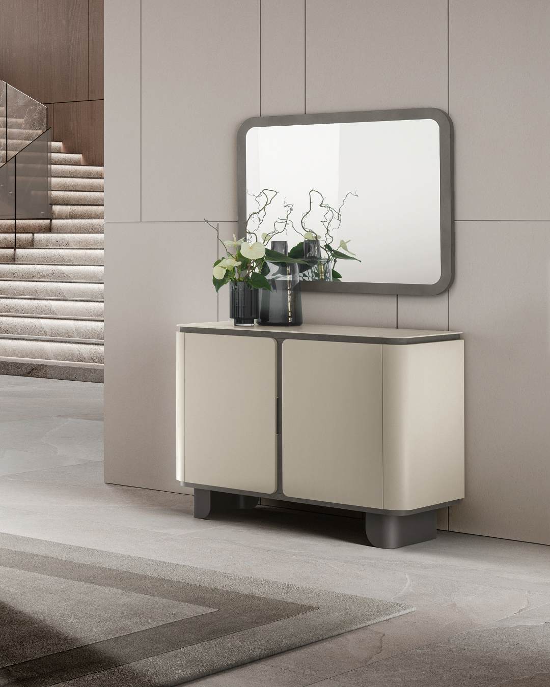 La cornice grigio antracite, definita da angoli stondati, ne richiama il segno morbido e contemporaneo. In vetro molato è disponibile in una versione piccola da abbinare al contromobile a 2 ante e grande per il contromobile a 4 ante.