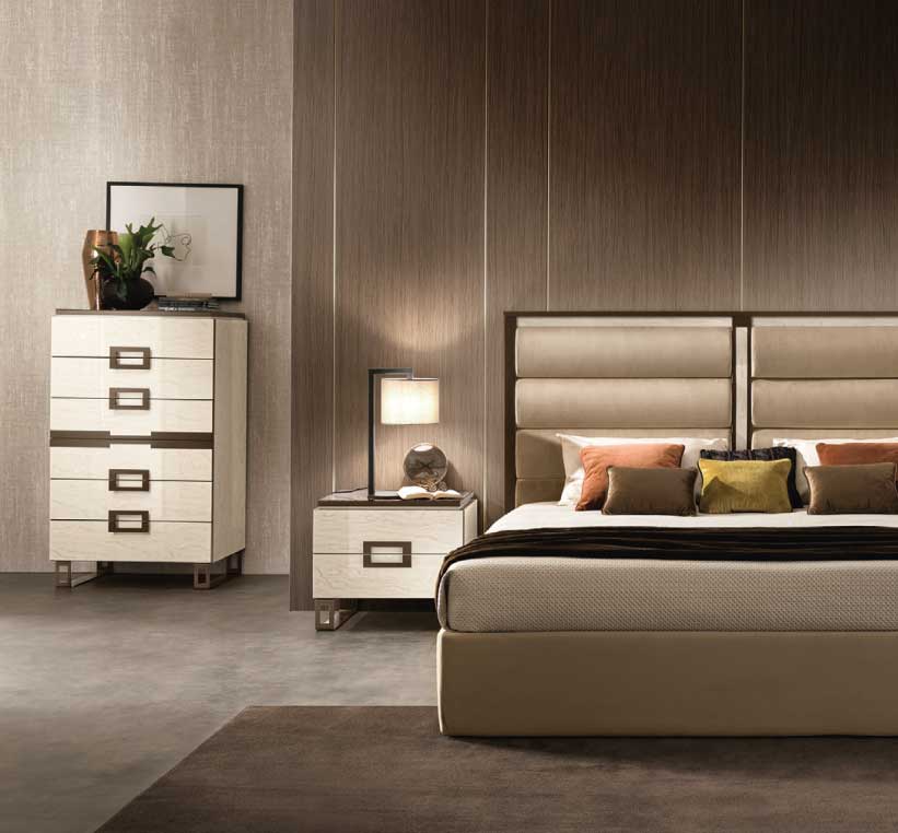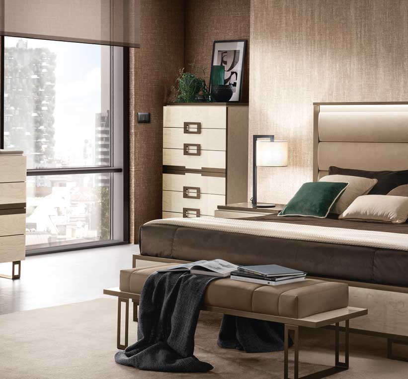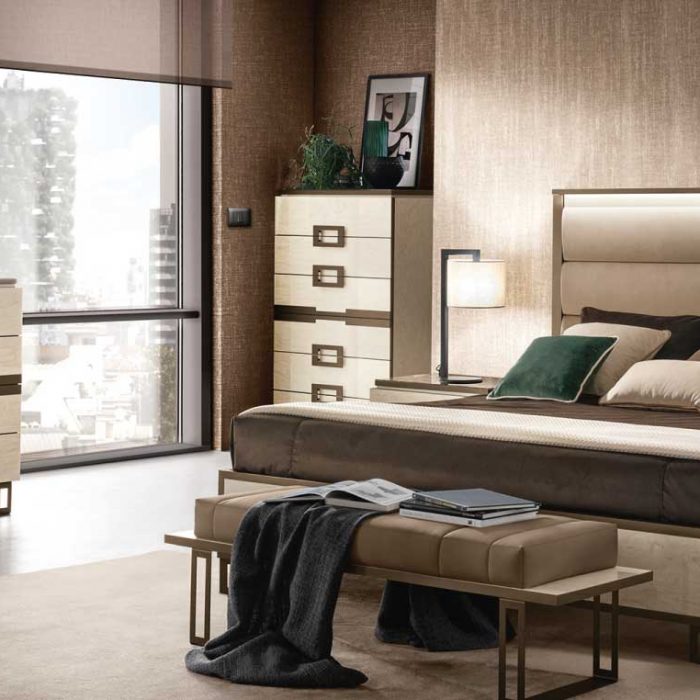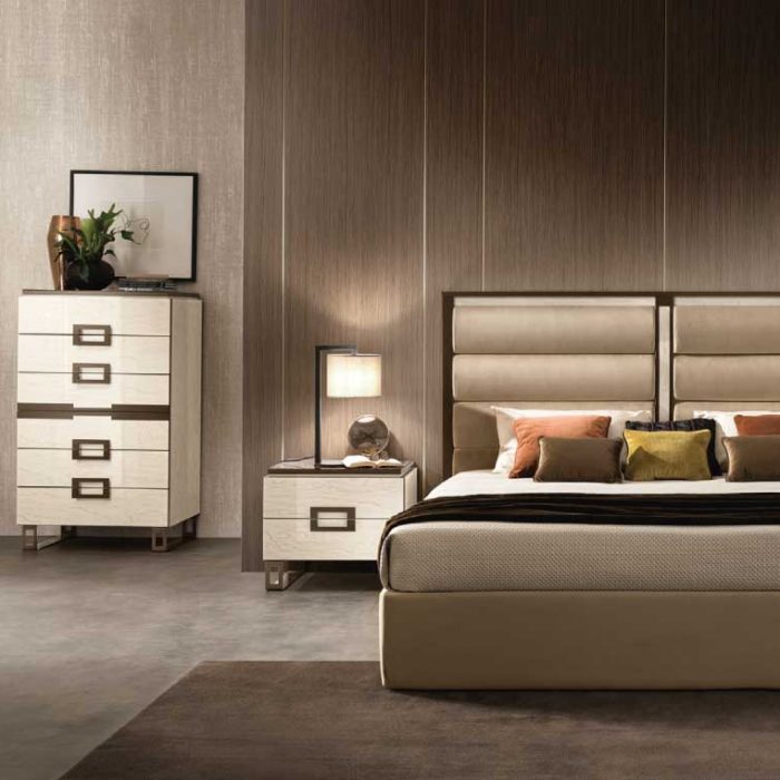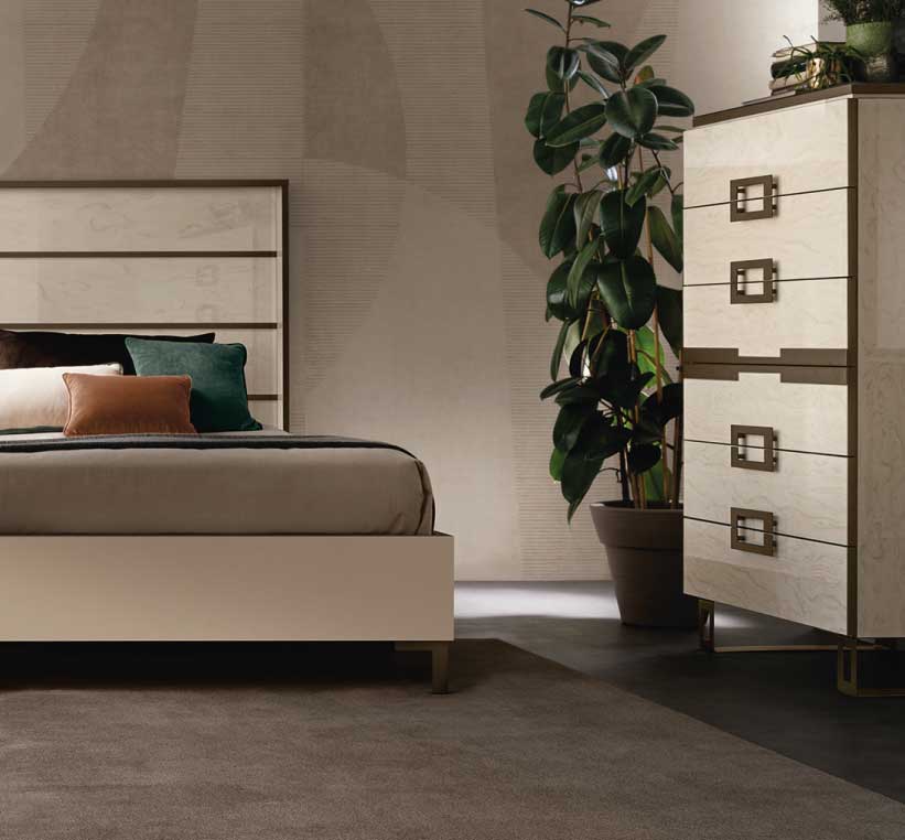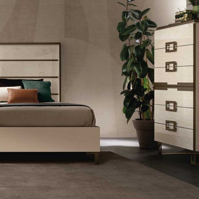 Il settimino riprende il design dei comodini, ampliando la capacità contenitiva da due a sei cassetti, e introduce una variazione estetica che nel comodino non è presente: la decorazione centrale, “simulando” la presenza di una maniglia, contribuisce a esaltare la simmetria della composizione e conferma la cifra stilistica della geometria e del contrasto cromatico.
