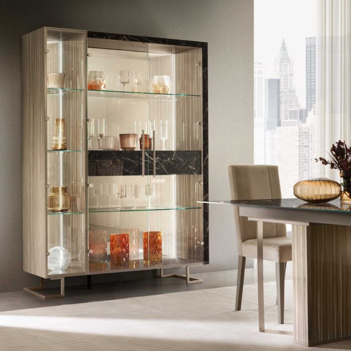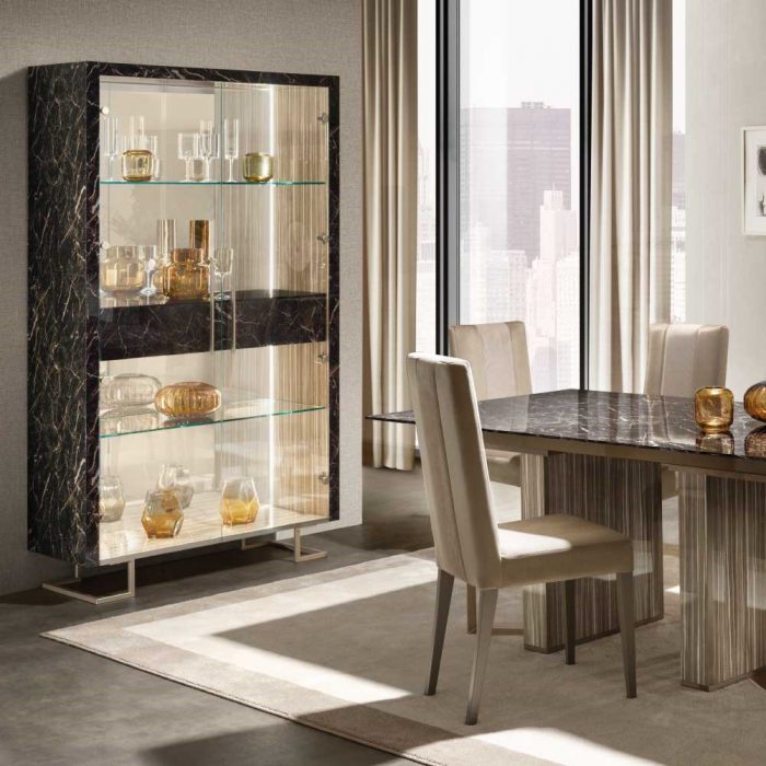 Caratterizzati dalla suggestiva contrapposizione cromatica tra la finitura chiara del legno effetto Zebrano e quella scura della finitura marmo Portoro Gold, i mobili vetrina Luce Dark possono essere configurati con due, tre o quattro ante, in base alle diverse esigenze di spazio.