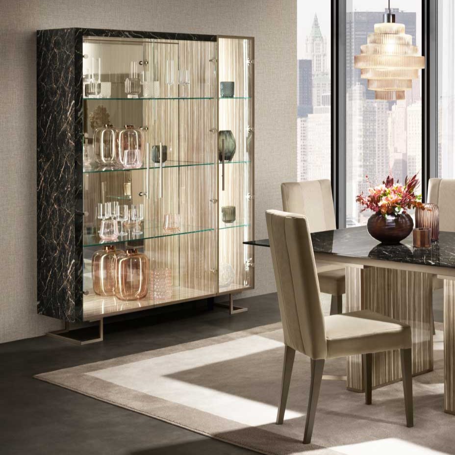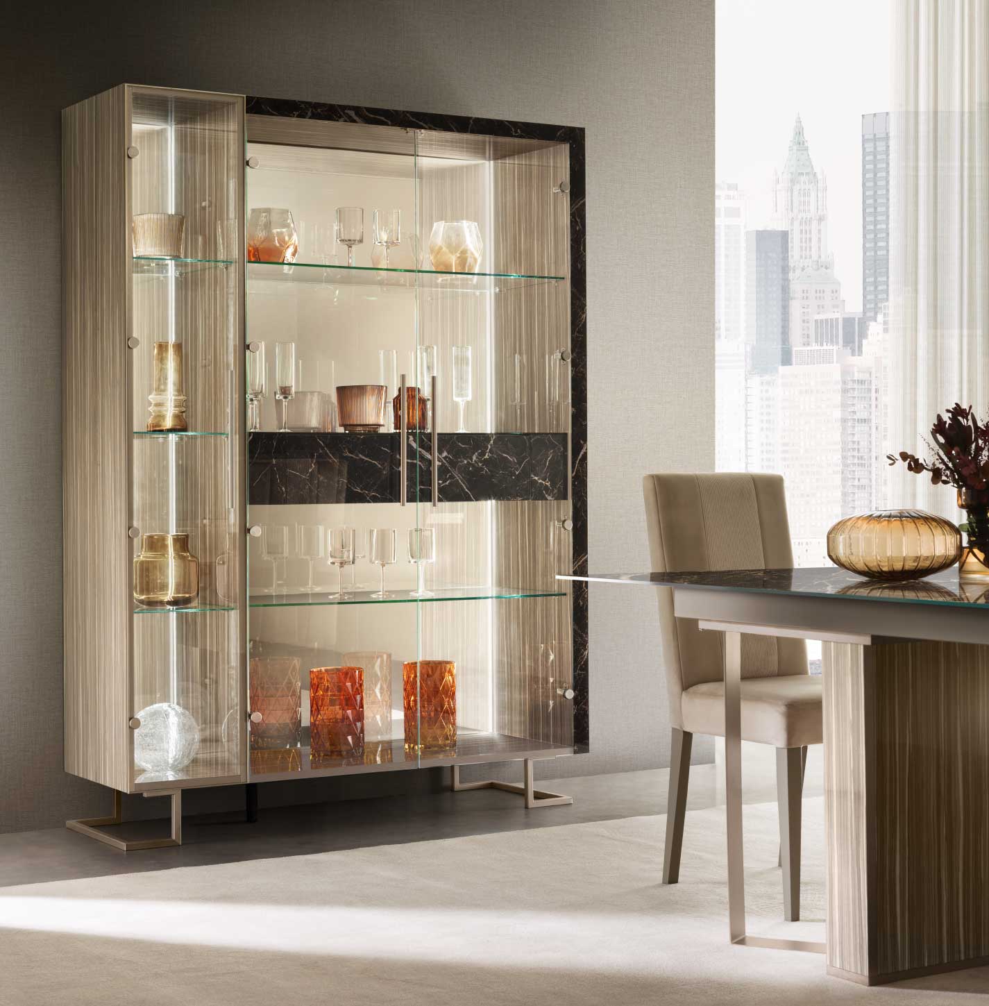 Caratterizzati dalla suggestiva contrapposizione cromatica tra la finitura chiara del legno effetto Zebrano e quella scura della finitura marmo Portoro Gold, i mobili vetrina Luce Dark possono essere configurati con due, tre o quattro ante, in base alle diverse esigenze di spazio.