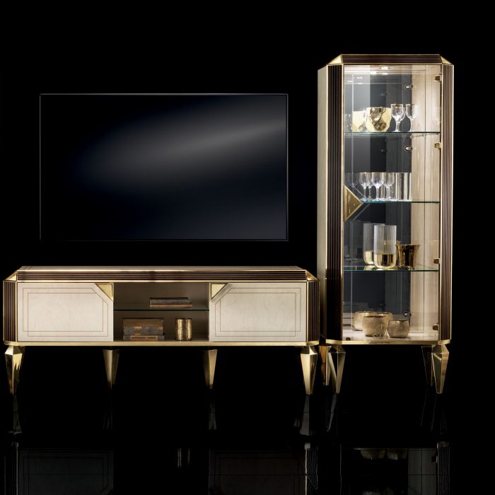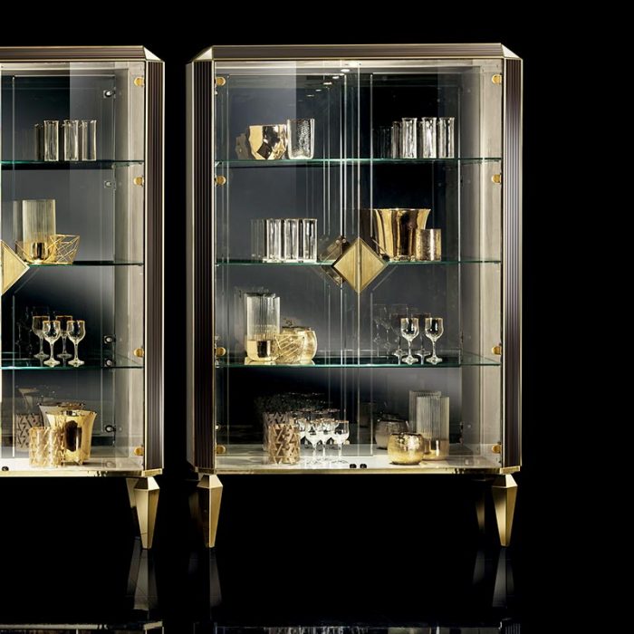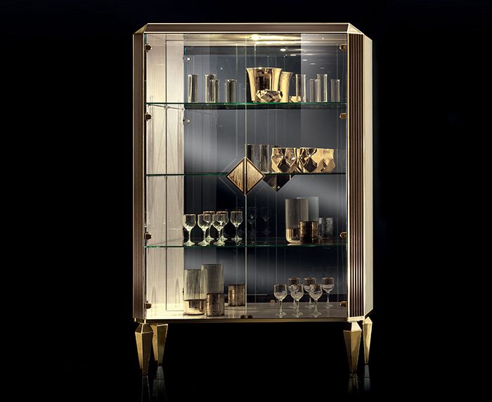 C’è sempre bisogno di luce per far brillare qualcosa: è questo il concetto alla base delle vetrine Diamante. Il frontale in vetro, incastonato nell’essenzialità delle cornici in olmo con leggere nervature dorate, è perfetto per accogliere i vostri oggetti più cari.